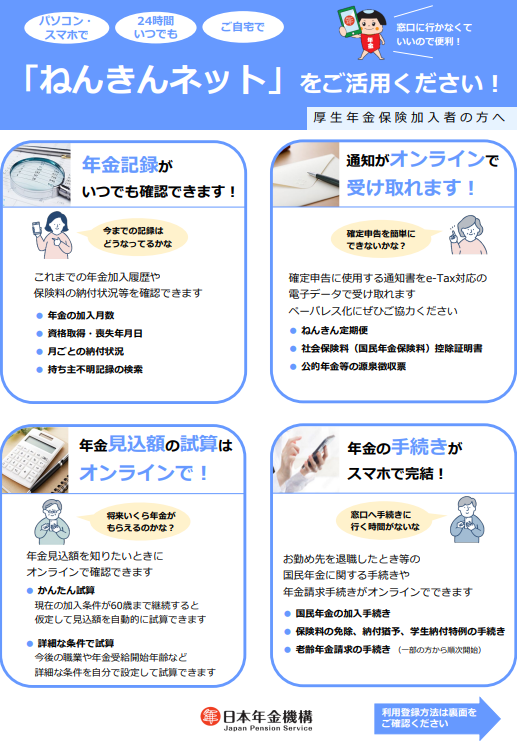 タイトル:「ねんきんネット」をご活用ください!(厚生年金保険加入者の方へ)(2025年4月版) 発行者:日本年金機構発行時期:2025年4月ページ数:2ページ概要:厚生年金保険加入者の方へねんきんネットの活用を促進するた […]