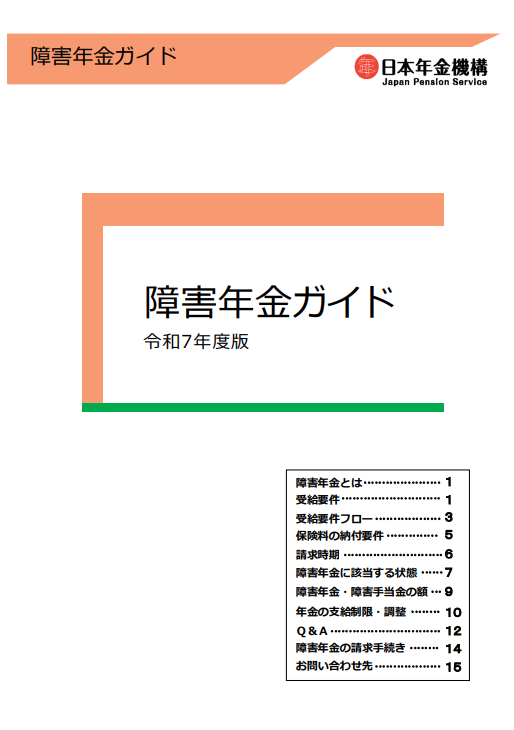 タイトル:障害年金ガイド(令和7年度版) 障害基礎年金・障害厚生年金の仕組み発行者:日本年金機構発行時期:2025年4月ページ数:16ページ概要:障害基礎年金・障害厚生年金・障害手当金の仕組みをまとめたパンフレット Do […]