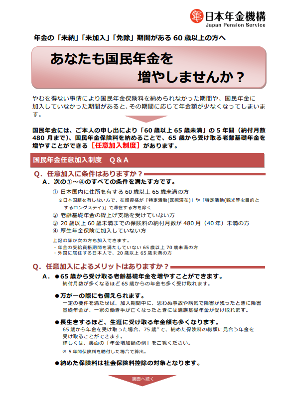 タイトル:あなたも国民年金を増やしませんか?(任意加入制度のご案内)(2025年4月版)発行者:日本年金機構発行時期:2025年4月ページ数:2ページ概要:60歳以上65歳未満の方に対して、任意加入制度の概要と手続きにつ […]