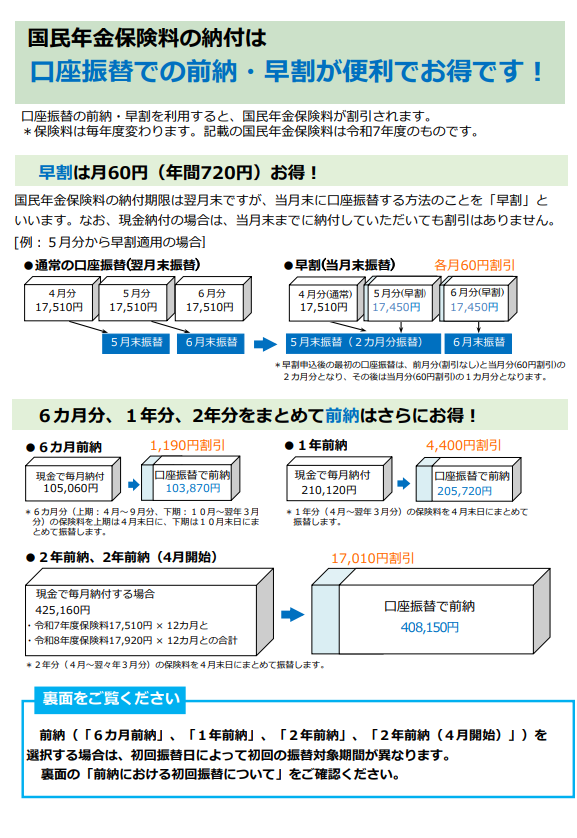 タイトル:国民年金保険料は口座振替での前納・早割が便利でお得です!(2025年4月版)発行者:日本年金機構発行時期:2025年4月ページ数:2ページ概要:国民年金保険料納付における口座振り込みのメリットと手続きについて解 […]