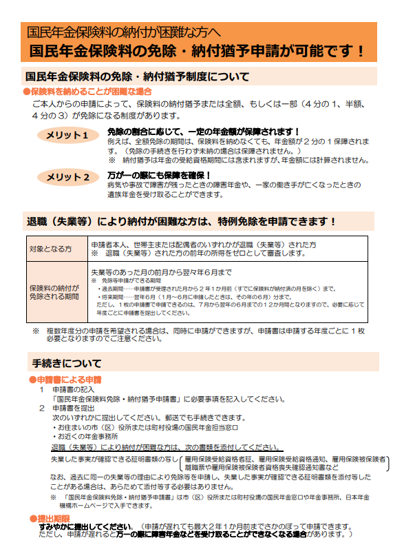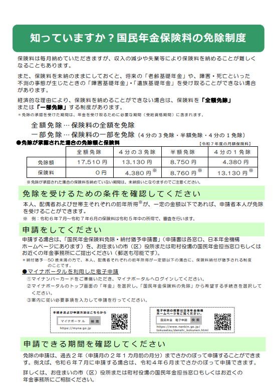 タイトル:知っていますか?国民年金保険料の免除制度(2025年4月版)発行者:日本年金機構発行時期:2025年4月ページ数:2ページ概要:収入の減少や失業等により国民年金保険料を納めることができなくなった場合の保険料免除 […]