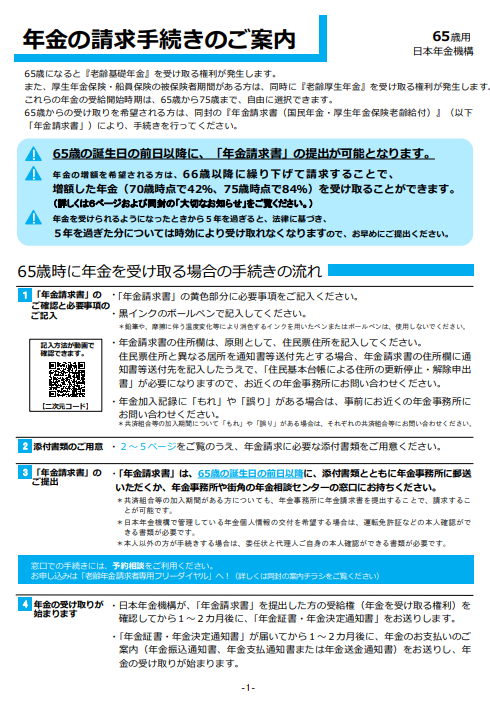 タイトル:年金の請求手続きのご案内(65歳用)(2024年11月版)発行者:日本年金機構発行時期:2024年11月ページ数:6ページ概要:年金の請求手続きについて説明した、65歳向けのリーフレット。手続きの流れや必要な添 […]