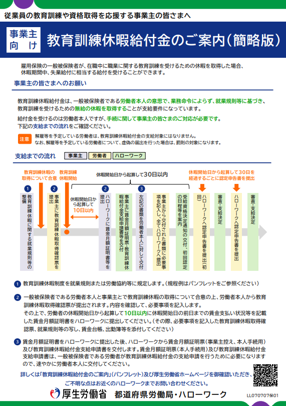 タイトル:事業者向け 教育訓練休暇給付金のご案内(簡略版)発行者:厚生労働省・都道府県労働局・ハローワーク発行時期:2025年7月ページ数:1ページ概要:このリーフレットは、教育訓練休暇給付金制度について事業主に向けた案 […]