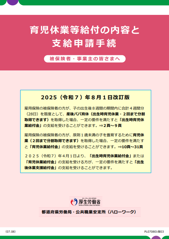 タイトル:育児休業等給付の内容と支給申請手続 発行者:厚生労働省・都道府県労働局・ハローワーク 発行時期:2025年8月 ページ数:16ページ 概要:このリーフレットは、育児時短就業給付に関する内容と支給申請手続きについ […]