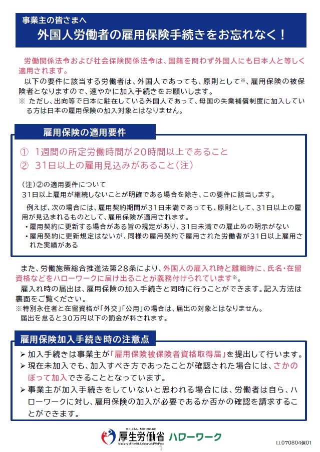タイトル:外国人労働者の雇用保険手続きをお忘れなく! 発行者:厚生労働省 発行時期:2025年8月 ページ数:2ページ 概要:このリーフレットは、外国人労働者の雇用保険手続きについて説明している。日本における雇用保険は国 […]