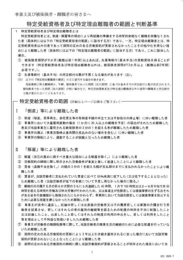 タイトル:特定受給資格者及び特定理由離職者の範囲と判断基準 発行者:厚生労働省 発行時期:2025年7月 ページ数:8ページ 概要:このリーフレットは、特定受給資格者と特定理由離職者の範囲及び判断基準について詳細に説明し […]