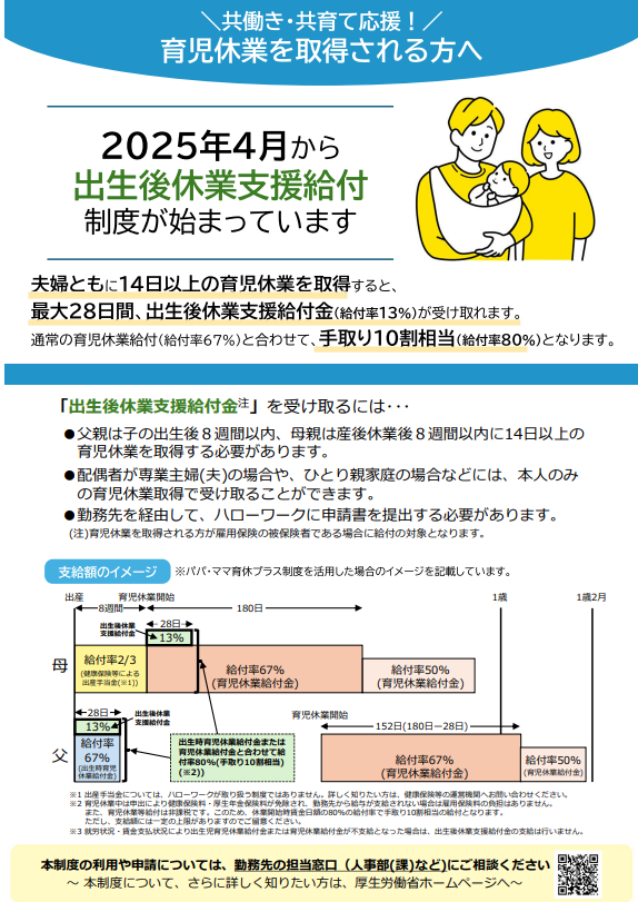 タイトル:2025年4月から出生後休業支援給付制度が始まっています発行者:厚生労働省発行時期:2025年9月ページ数:1ページ概要:このリーフレットは、2025年4月から始まる「出生後休業支援給付制度」に関する情報を提供 […]