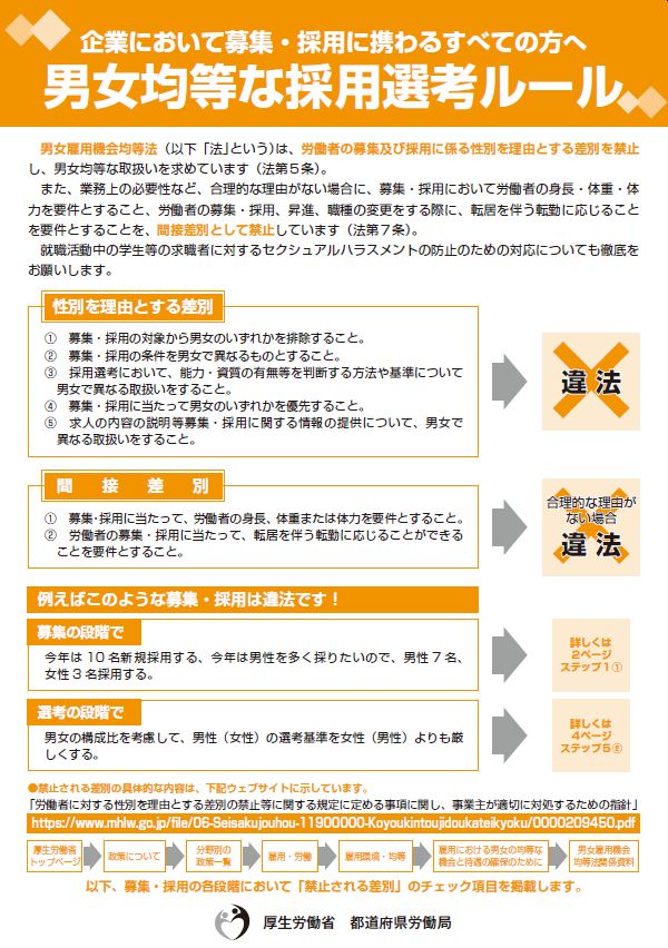 タイトル:男女均等な採用選考ルール 発行者:厚生労働省 発行時期:2025年6月 ページ数:8ページ 概要:このリーフレットは、男女均等な採用選考ルールに関する情報を提供している。男女雇用機会均等法に基づき、性別を理由と […]