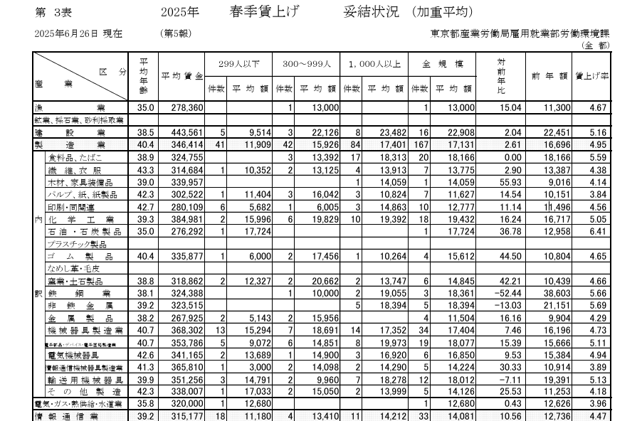 東京都は都内の1,000労働組合を対象に実施した年末一時金要求・妥結状況調査の中間集計結果(令和7年11月6日現在)を公表しました。なお、今回の結果は196社の集計となっています。 既に妥結した労働組合のうち、前年妥結額 […]