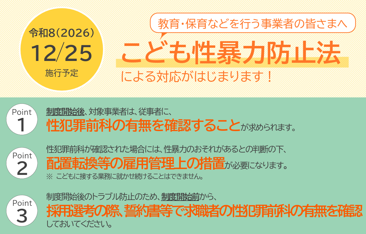 性暴力は、こどもの心身の発達に深刻な影響を及ぼし、断じて許されるものではありません。そこでこども性暴力防止法が2026年12月25日に施行され、対象事業者に対して、従事者の性犯罪前科の確認をはじめとする、こどもへの性暴力 […]