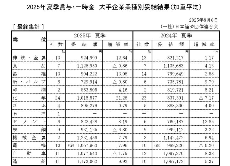 経団連から、大手企業にかかる2025年夏季賞与の妥結結果最終集計が公表されました。本調査の対象は、原則として従業員500人以上、主要23業種大手247社で、今回は集計可能な23業種154社の結果となっています。 これ […]