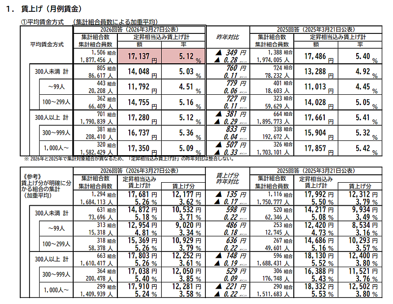 連合の2026年春闘第2回集計は前年ほぼ同水準の17,137円(5.12%)