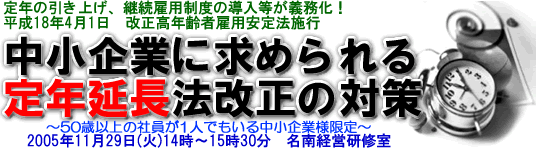 高年齢者雇用安定法の改正により、平成18年4月1日から65歳までの定年の段階的引上げや継続雇用制度の導入等、高年齢者雇用の確保措置を講ずることが義務付けられました。この法改正を受けて企業では、高齢者の雇用のあり方を抜本的に見直さなければならなくなりましたが、まだまだ多くの企業、とりわけ中小企業では、この法改正により当社はどういった影響を受け、そのための対策はどのように講じなければならないか、模索しているのが現状ではないかと思います。