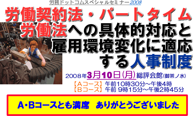みなさん、こんにちは 名南経営大津です。この度は当セミナー「労働契約法・パートタイム労働法への具体的対応と雇用環境変化に適応する人事制度」に多くのお申込みを頂きましてありがとうございました。BLOG等でもお伝えしております通り、1月22日にいったん満席となりましたが、その後も多くのキャンセル待ちのお申込みを頂いておりました。みなさんのご希望に何とかしてお応えしたいと思い、追加日程の設定などを検討しておりましたが、偶然、同じ3月10日に同じ総評会館の別の研修室が空いておりましたので、変則ではありますが、同日の同会場で追加講演を実施させて頂くこととなりました。 当初ご案内の日程(Aコース)では、午前10時半より正午までが弊社小山の講演、午後1時から4時までが山中健児先生の講演となっておりますが、今回追加のBコースでは、午前と午後の講師を入れ替え、午前9時15分から午後12時15分までが山中健児先生、午後1時15分から午後2時45分までが弊社小山の講演を実施します。(厳しい時間設定にも関わらず、快諾いただきました山中先生には心より感謝しております。ありがとうございました。) 結果として約40名様分の追加席を確保できましたので、この最後の機会に是非お申込み下さい。 毎年3月に開催しております労務ドットコム スペシャルセミナーですが2008年も開催が決定しました。今年は3月10日(月)に東京で、石嵜信憲法律事務所の山中健児弁護士と、弊社人事コンサルタントの小山邦彦によるジョイントセミナーを開催します。今春の人事労務における最大のトピックであるパートタイム労働法と労働契約法の実務対応を山中弁護士に、また小山には2008年の人事制度のトレンドを予測してもらいます。今回のセミナーは名南経営の人事労務セミナーの2008年キックオフとなります。また前泊が必要になる遠方のみなさんにもご参加いただきやすいように月曜日の開催としておりますので、多くのみなさんのご参加をお待ちしております。 |