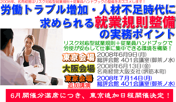 日 時 平成20年6月13日(金)午後1時30分から午後4時30分講 師 株式会社名南経営 社会保険労務士 大津章敬・福間みゆき 会 場 名南経営 大阪事務所 大阪市中央区北久宝寺町二丁目2番地13号 堺筋本町セントラルビル7F 電話 06(4964)6135 地下鉄中央線/堺筋線「堺筋本町」駅10番出口より南へ徒歩5分 受講料 20,000円(税込) 定 員 30名 [受講者のみなさんへの特典] 本セミナーにご参加のみなさんには、後日、就業規則整備の個別無料相談(ご来社もしくはお電話)に対応させて頂きます(希望者・予約制)。 |