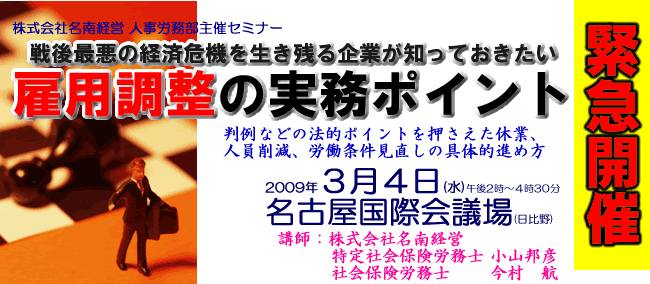 中部地方に戦後最悪と言ってよいほどの景気後退の大波が到来しています。昨年末は生産調整に伴う「派遣切り」など非正規労働者の雇用調整が大きな社会問題となりましたが、年明け以降の状況はより厳しさを増し、今後は正社員の雇用にまで手を付けなければ存続できない企業が急増することは避けられないところまで来ています。特に愛知県は大手自動車メーカーの大規模な生産調整による休業や大手家電メーカーの生産拠点の集約など、雇用問題は深刻な状態にあり、雇用調整助成金の相談件数も全国で飛び抜けて多く、まさに混乱状態に陥っているといっても過言ではありません。 雇用調整と一言でいっても、残業規制から一時帰休、希望退職、退職勧告、整理解雇まで様々な段階があり、最終的な指名解雇が有効とされるためには、企業には解雇回避努力の実施など、様々な取り組みが求められています。法令や各種判例等によって確立されたステップを無視した雇用調整は無用な労使紛争を招くだけではなく、最悪の場合には企業の存続さえも危機に陥れかねません。そこで今回のセミナーでは、この厳しい経営環境の中を企業が生き延びるための雇用調整の実務ポイントについて、実際に使用できる各種書式なども用いながら、具体的にお話させていただきます。
