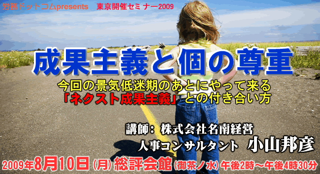 いま、毎日のように業績悪化に関する企業からの相談・支援が続いています。このような時期は人事制度を抜本改定する企業は少ないのですが、バブル崩壊をはじめとして過去数回の経済ショックの歴史を見ると、底を打った後の回復期には、限られた原資を合理的に配分するための人事パラダイムが台頭して人事制度改定ラッシュが来ています。今回も来年後半あたりからこの風潮、つまり「ネクスト成果主義(差がつく人事)」の登場が予測されます。しかし一方で、ワークライフバランス、過重労働対策、次世代育成支援、メンタルヘルス、ハラスメント対策という最近のキーワードを見ると、企業には「個の尊重」がますます求められているようです。「成果主義」と「個の尊重」、この対立する概念の折り合いをどうつけるか。これが今回のテーマです。