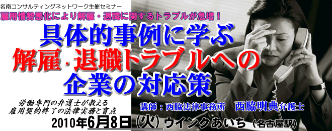 | いつの時代も解雇や雇止めは労働トラブルの最大の原因でありますが、近年は従業員の権利意識の向上や雇用形態の多様化によってその問題は更に深刻化かつ複雑化しています。例えば、業績悪化による人員削減を行う場合、継続雇用制度により雇用が保障されている60歳以降の嘱託従業員や育児休業者をどのように扱えばよいのかなど、従来にはなかった様々な論点が存在し、教科書どおりには進められない事例が急増しています。そこで名南経営では今回、労働問題を専門とされている西脇法律事務所の西脇明典弁護士を講師にお招きして、この問題に関するセミナーを開催することとなりました。具体例に基づく分かりやすい講義となっておりますので、是非、ご参加下さい。 |