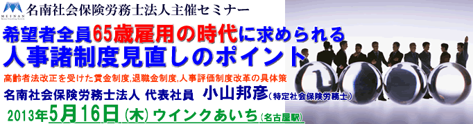 日時および会場 2013年5月16日(木)午後2時〜午後4時30分 ウインクあいち 1202会議室(名古屋駅) 講師 株式会社名南経営 常務取締役/名南社会保険労務士法人 代表社員 小山邦彦(特定社会保険労務士) 受講料 8,400円(税込) ※名南コンサルティングネットワーク顧問先様およびMBC特別会員様は2名様まで無料でご招待 対 象 企業の経営者および人事労務担当者のみなさま 定 員 70名 |