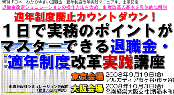 日 時 平成20年9月19日(金)午前10時から午後4時30分講 師 株式会社名南経営 人事コンサルタント 大津章敬 会 場 アルカディア市ヶ谷(市ヶ谷) 東京都千代田区九段北4-2-25(TEL 03-3261-9921) □地下鉄 東京メトロ有楽町線・南北線 市ヶ谷駅 A1-1出口(徒歩2分) 都営地下鉄新宿線 市ヶ谷駅 A1-1出口(徒歩2分) □JR 中央線 市ヶ谷駅(徒歩2分) 受講料 25,000円(税込) 対 象 退職金・適格退職年金改革を予定されている企業の経営者および実務担当者のみなさま 社会保険労務士など、同改革の支援を担当されるみなさま 定 員 35名 備 考:退職金制度改定シミュレーションの解説については講師がスクリーンにパソコン画面を映しながら手順を説明します。当日の演習はございませんので、パソコンをお持ちいただく必要はありません。 |
